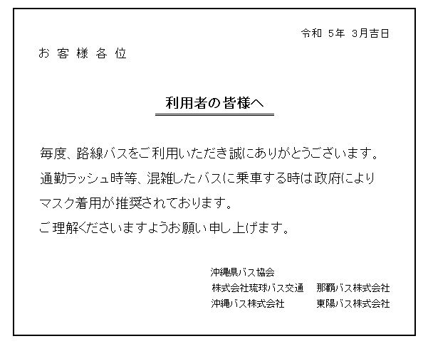 琉球バス交通・那覇バスにおいては、引き続き社内の感染対策の継続のため、また、お客様へ安心してご乗車いただけますよう、当面の間は乗務員のマスク着用を継続いたします。