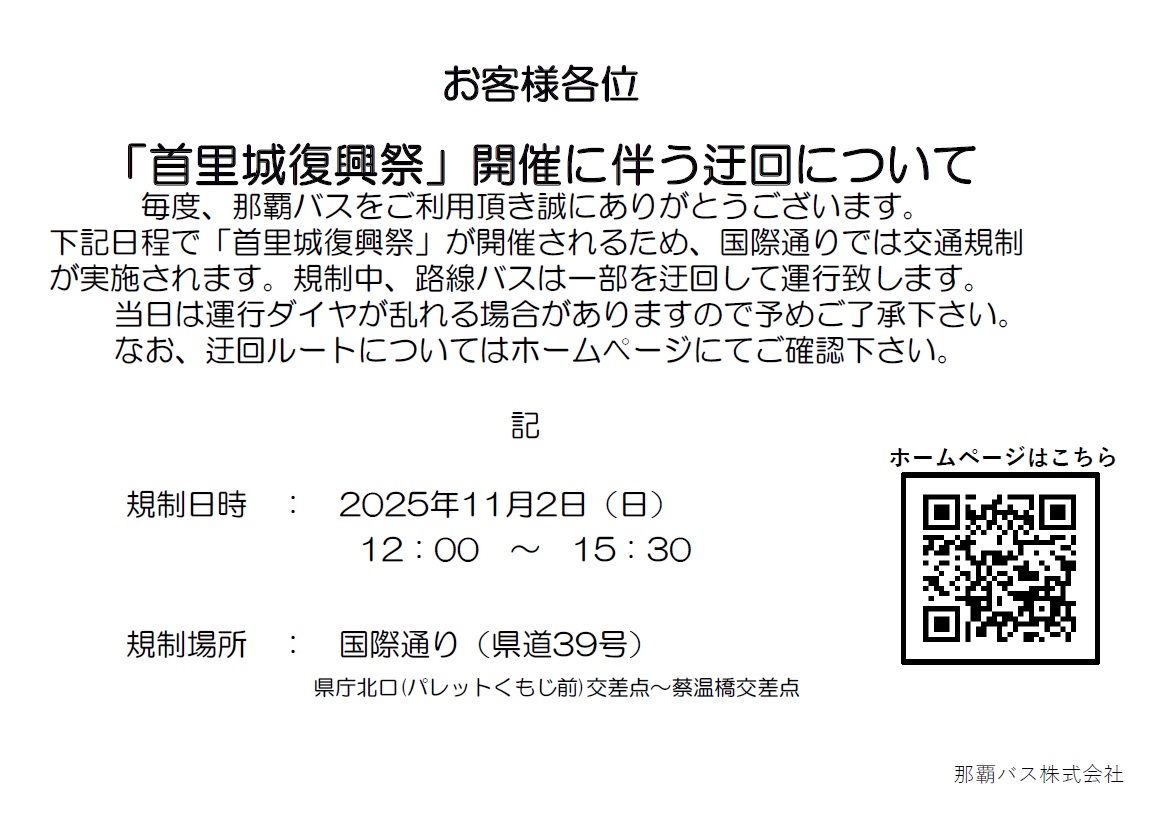【那覇バス】11月2日(日)首里城復興祭に伴う迂回について