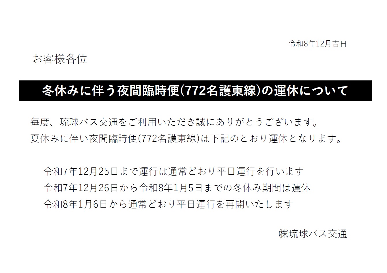 【12月26日~1月5日】772番名護東線 夜間臨時便運休について