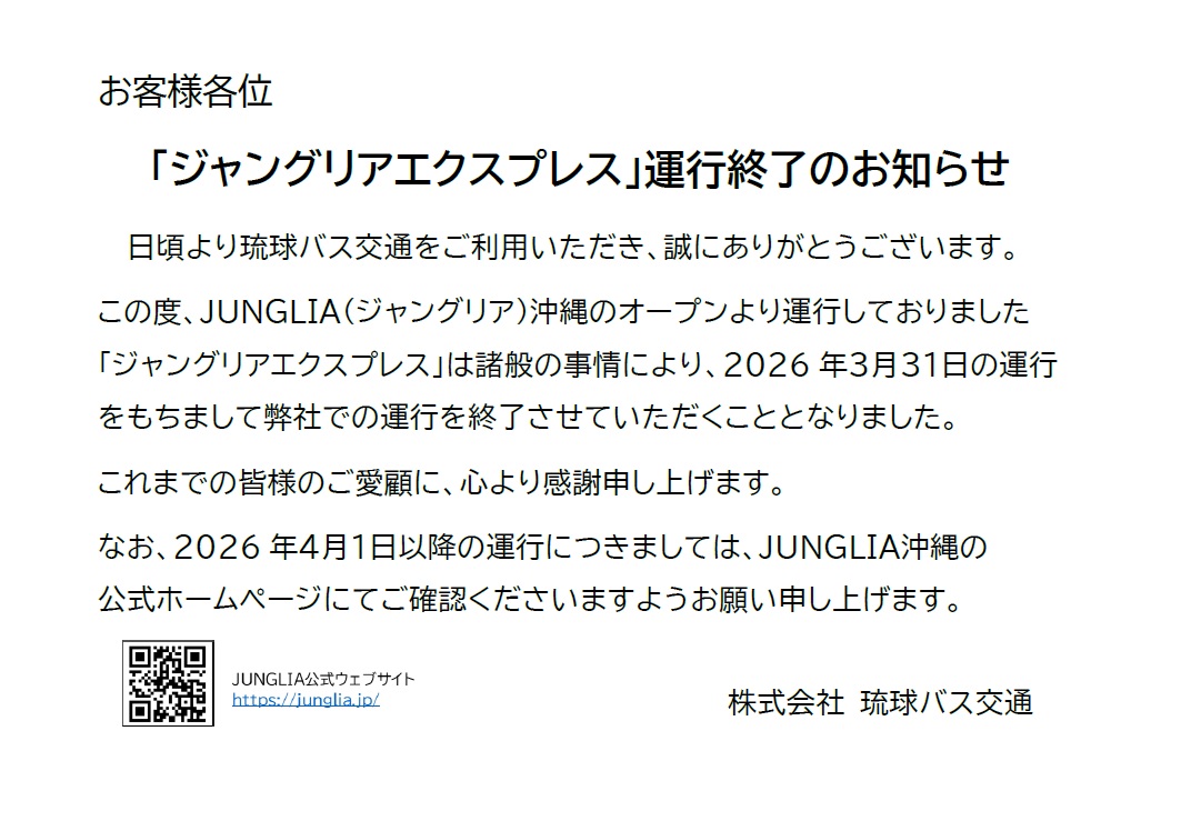 対象路線: ジャングリアエクスプレス / オフィシャルホテルシャトルバス 運行終了日: 2026年3月31日(火)